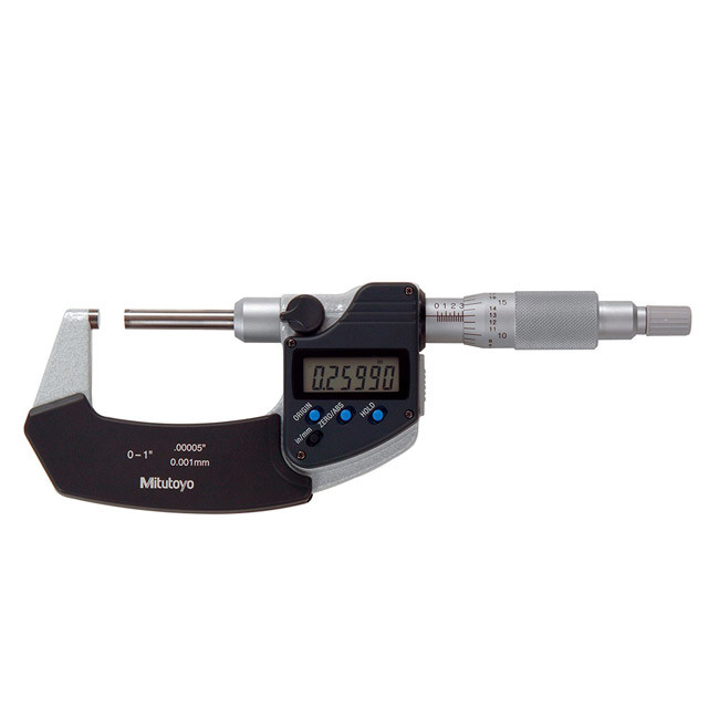 The Mitutoyo 406 series Coolant Proof LCD micrometer has a digital single-value LCD readout that displays in metric units with resolution to 0.001mm, a ratchet-stop mechanism that helps provide precise, repeatable measurement, and a non-rotating spindle that helps provide steady positioning during measurement.