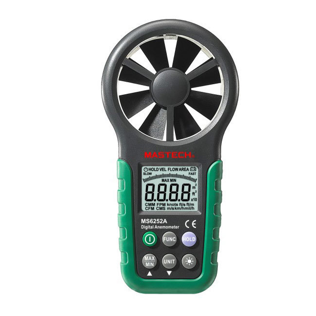 MS6252A is a digital anemometer for measuring the ambient temperature, humidity, dew point temperature, wet bulb temperature, wind speed, and air volume. This is a portable, professional measuring instrument with large-screen LCD and backlight, multi-unit switching functions. This can be used for hand-held or fixed measurement with the functions of reading hold, maximum, minimum, etc.
