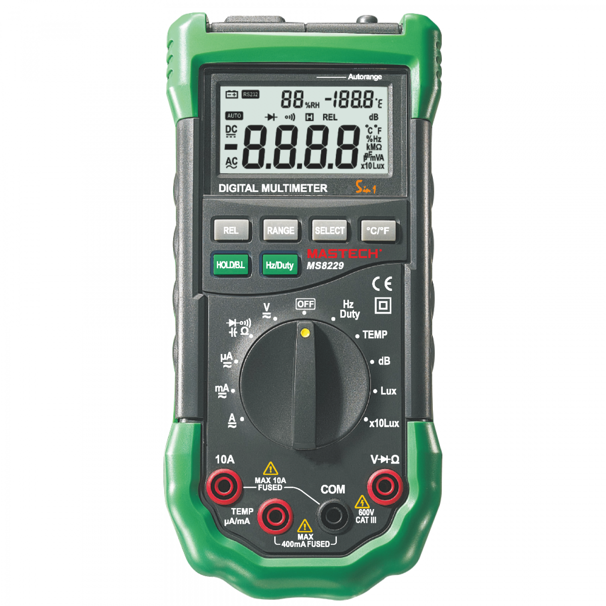 Auto Range Multimeter & Temperature Humidity Light Lux Sound Level Meter Tester 5 in 1 with Back Light